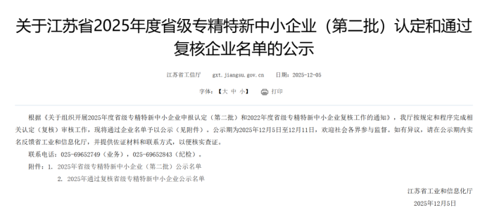 12月5日,江苏省工业和信息化厅发布《关于江苏省2025年度省级专精特新中小企业(第二批)认定和通过复核企业名单的公示》,苏州快信通信息科技有限公司成功荣获省级“专精特新中小企业”,成为苏州首家档案服务行业“专精特新中小企业”。